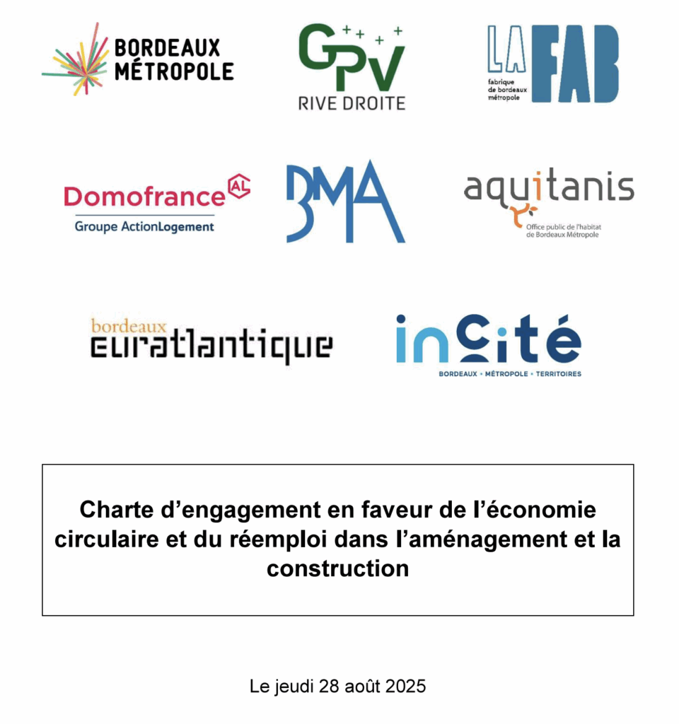 Jeudi 28 août, La Fab a co-signé, avec d’autres maîtres d’ouvrage de Bordeaux Métropole, la « charte d’engagement en faveur de l’économire circulaire et du réemploi dans l’aménagement et la construction« , en présence de Jean-Baptiste Thony, conseiller métropolitain délégué à l’économie circulaire et la propreté.