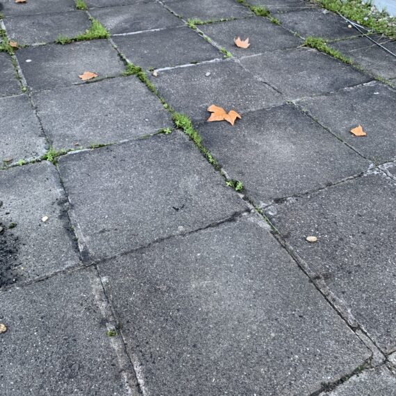 Dalles béton de cheminement sur toiture plate et gravillons avec jointoiement ciment